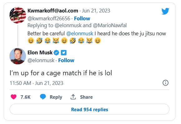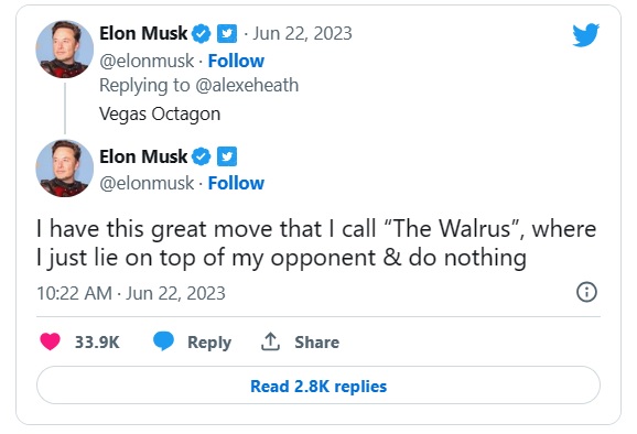이에 머스크도 "진짜로 합시다! 라스베가스 옥타온에서~저는 상대방위 누워서 아무것도 하지 않아도 이기는 "해마"라는 기술을 쓸 줄 압니다" 라고 다시 글을 보내며 이 상황을 더 뜨겁게 만들었습니다.