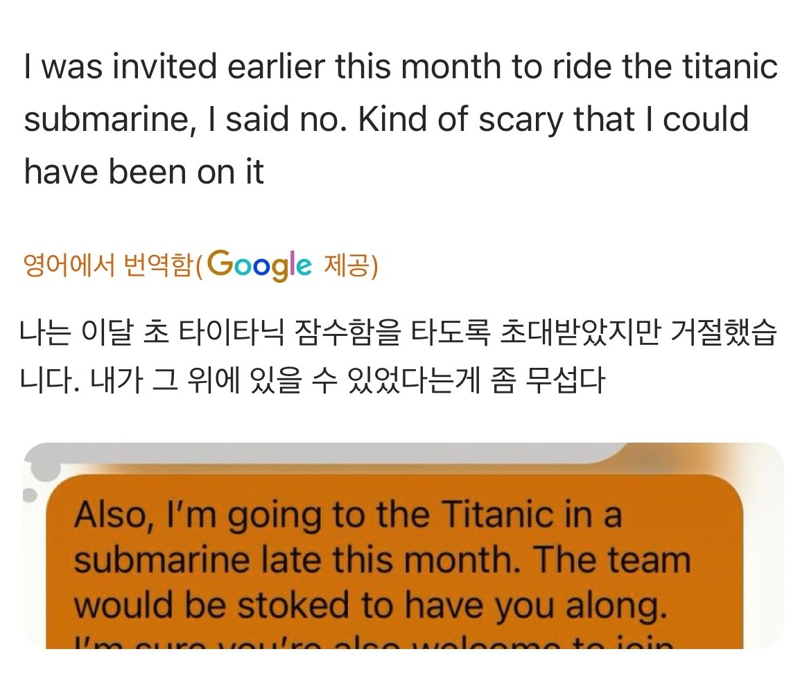 미스터 비스트는 트위터에서 "이달 초에 타이타닉 잠수함에 탑승해 달라는 초대를 받았지만 저는 거절했습니다. 내가 탈 수 있었다는 게 무섭습니다."라고 메시지를 적었습니다.